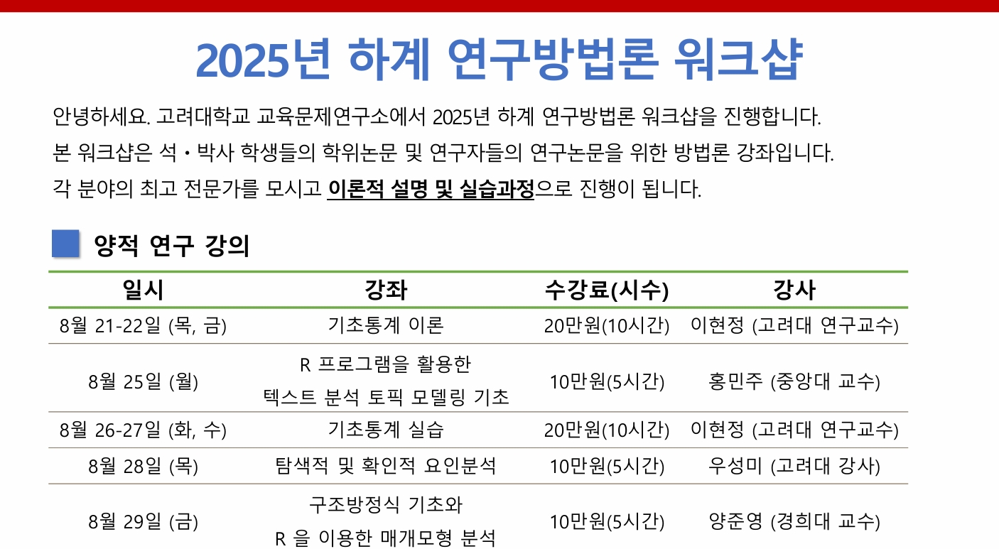 | 제목 | 2025년 하계 연구방법론 워크샵 |